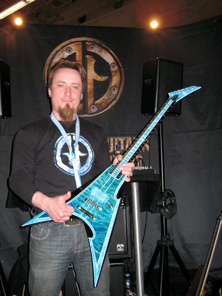 Tomasz from Mayones with a guitar finished with genuine leaves
