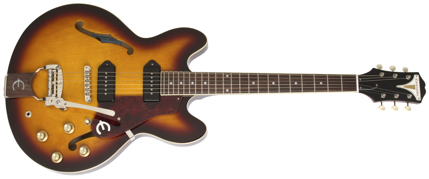 Epiphone’s new limited edition ”1961 Casino” is a very close remake of my favourite guitar as it was when it was released in 1961. It features P-90s with black plastic covers, a Gibson-type headstock (like on Paul McCartney’s Casino) with a metal logo, as well as a see-through faux-tortoise pickguard. Only 1,961 special edition Casinos will be produced, some with Epiphone’s own ”version” of a Bigsby vibrato, called Tremotone.
