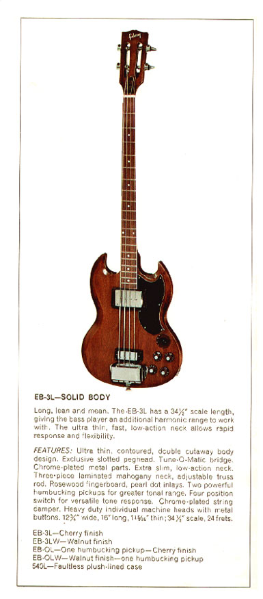 During the years 1969-74 Gibson also offered a long-scale version – the EB-3L – most of which featured a spanish-style headstock (see below). Because of its longer neck the EB-3L was noticeably neck-heavy, though.