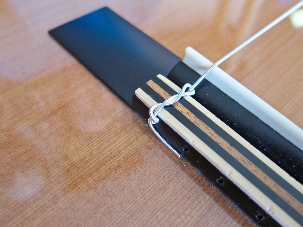 Feed one end of the fresh string through the neck-facing side of the bridge.