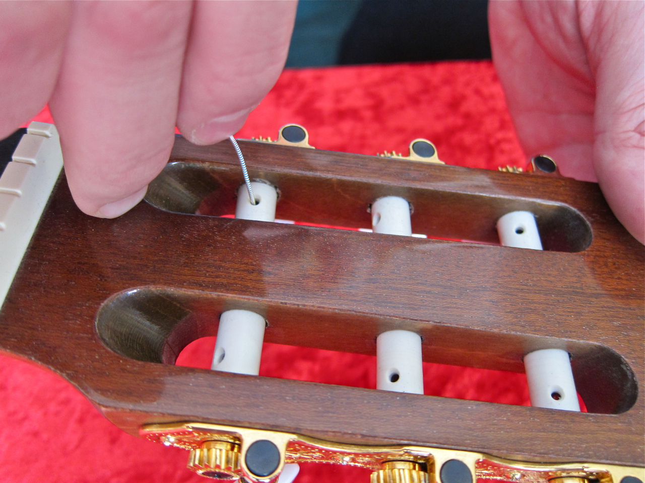 I find it easiest to string up a classical guitar from the nut upward, so I work in pairs – E-e, A-b, D-g.