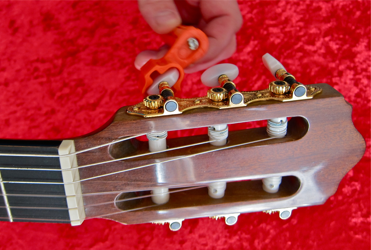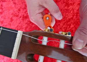 Here’s what you need for the procedure: A string winder comes in very handy for taking off and putting on the strings, and a tuner is needed to get the guitar up to pitch. I use a pair of scissors to make life a little easier for myself (see below). A polishing cloth may come in handy for cleaning and/or protecting your guitar.