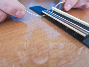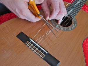 Once the strings are free from tension, I use the scissors to cut each string into two pieces. I find this makes taking the strings off a little easier, because you don’t have to feed all the string through either the tuner or the bridge for removal.