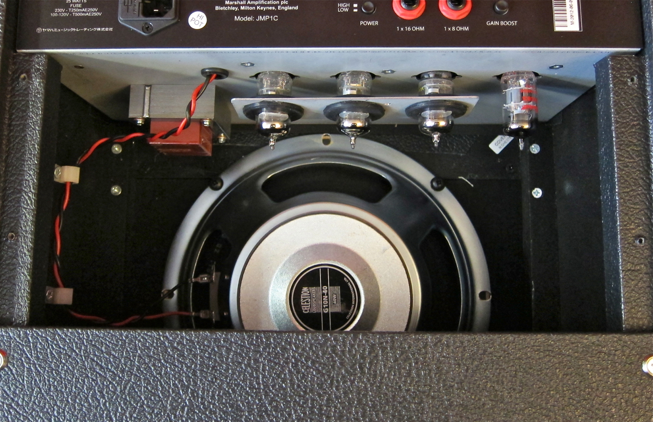 JMP1C:ssä käytetään peräti neljää putkea: kaksi ECC83/12AX7-etuasteputkea, sekä päätevahvistimessa kaksi ECC81/12AT7-mallia. Myös kaiutin on tässä toinen, nimittäin kymmenentuumainen Celestion G10N-40.