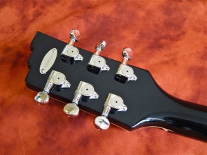 The one-piece mahogany neck is glued into the guitar’s mahogany body.