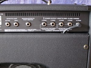 Takapaneelista löytyy liitännät efektilenkille ja kaiuttimille. Jalkakytkimellä (ei kuulu hintaan) voi tarvittaessa mykistää jousikaiun sekä efektilenkin signaalin.