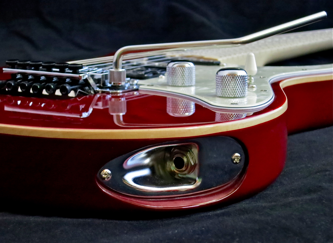 Lähtöjakki on asennettu rungon reunaan niin, että johto voidaan viedä luontevasti soittimen ja hihnan välistä eteenpäin vahvistimeen.