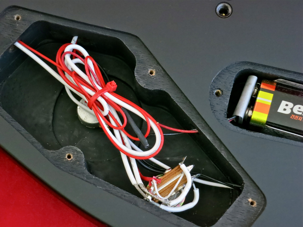 The control cavity displays clean workmanship. The battery compartment’s lid is screwed on with machine screws that grip into threaded inlets sunk into the body wood, which is a roadworthy solution.