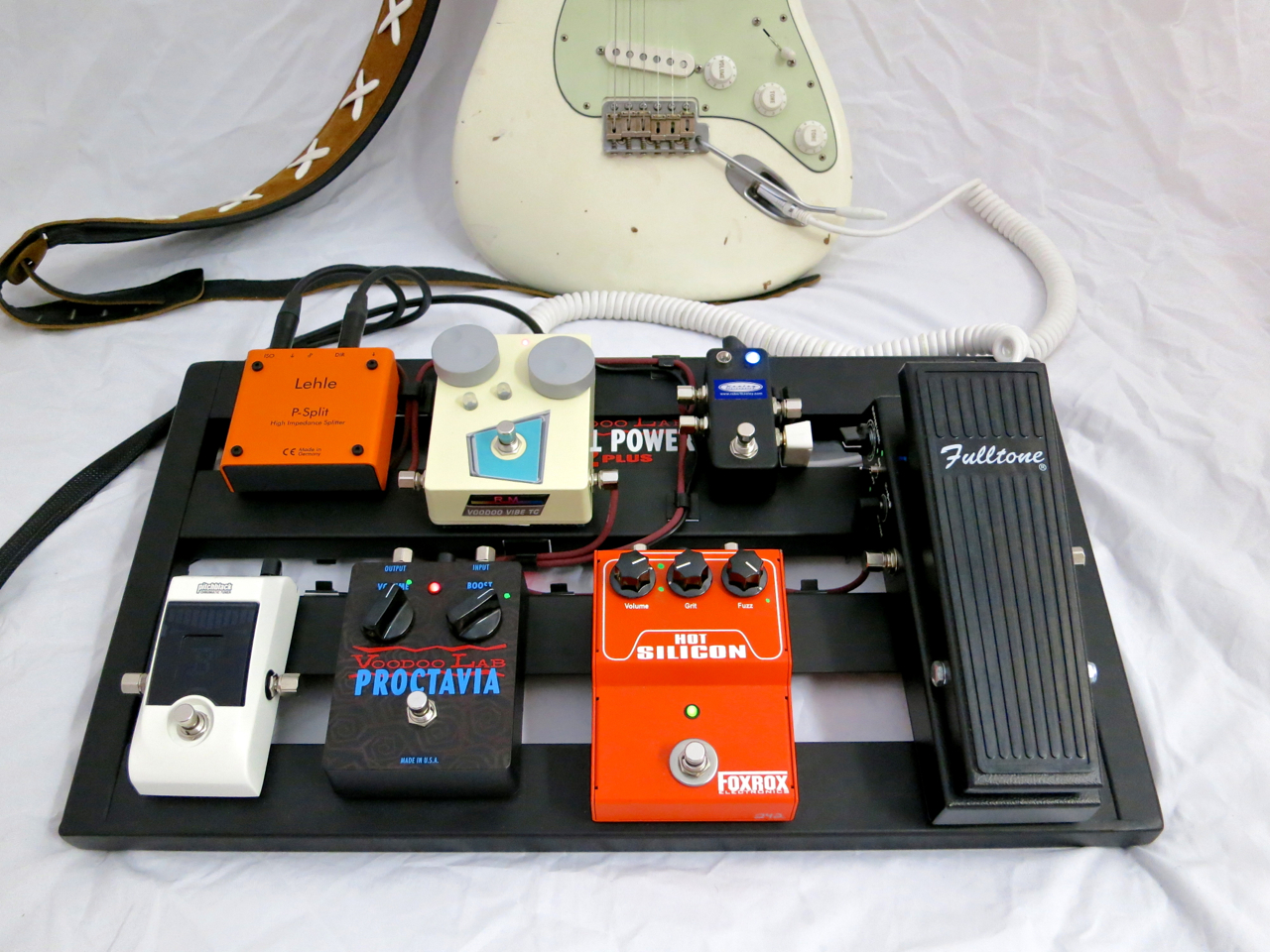 Pedaalien välijohdot on tehty juuri tätä pedaalilautaa varten käyttämällä Evidencen Monorail-johtoa sekä SiS-kulmaplugeja. Kaikki johdot on kiinnitetty turvallisesti ja siististi 3M-pidikkeillä.