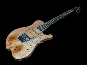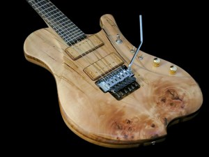 The Raadotar 6 is a very involved and intricate design, featuring a sandwiched body comprising a core made of claro walnut, black alder and wenge. The chambered body’s top and back are carved from bookmatched ambrosia maple. Ambrosia maple is not a a maple species per se, but rather maple which sports fungus ”damage” due to a prior ambrosia beetle infestation (similar to spalted maple).