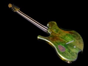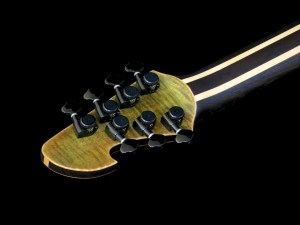The headstock’s back has received a figured maple overlay finished to match the body’s back…