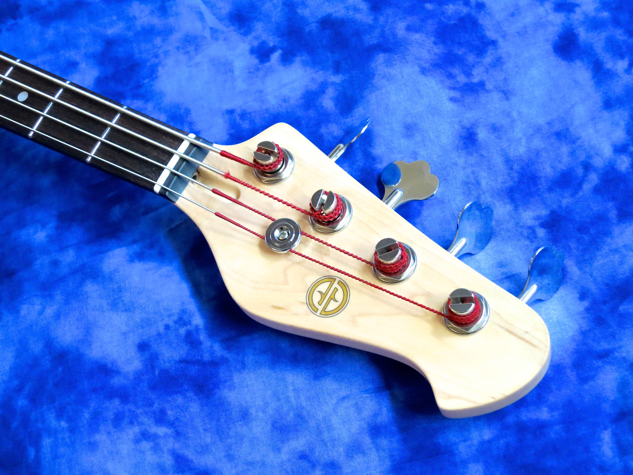 Duesenberg use their own locking Z-Tuners on the D-Bass. The string is first fed into a well in the tuning post until it comes out of a small hole in the tuning machine’s back. You cut off the surplus length of string, pull back the string by a couple of millimetres, lock it in place and tune up. Voila, a clean and uncluttered solution that leaves no sharp string ends.
