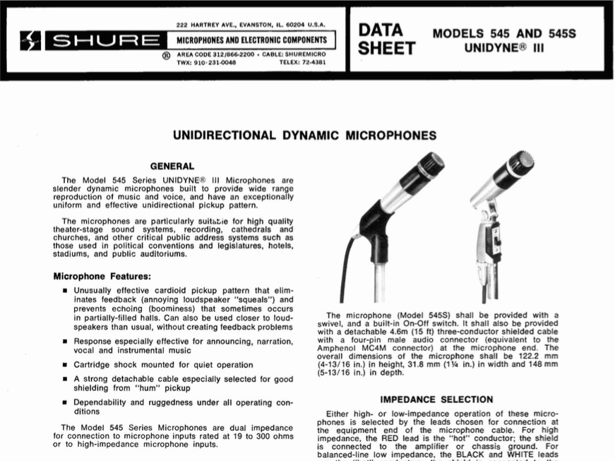 Their new Shure 545SD Unidyne III model was the first ”end-firing” unidirectional dynamic mic. The 545’s improved pneumatically isolated capsule also drastically reduced handling noise. This meant that the user could take the microphone into his/her hand and move around the stage, without having to worry about handling noise and feedback obliterating the performance or speech.