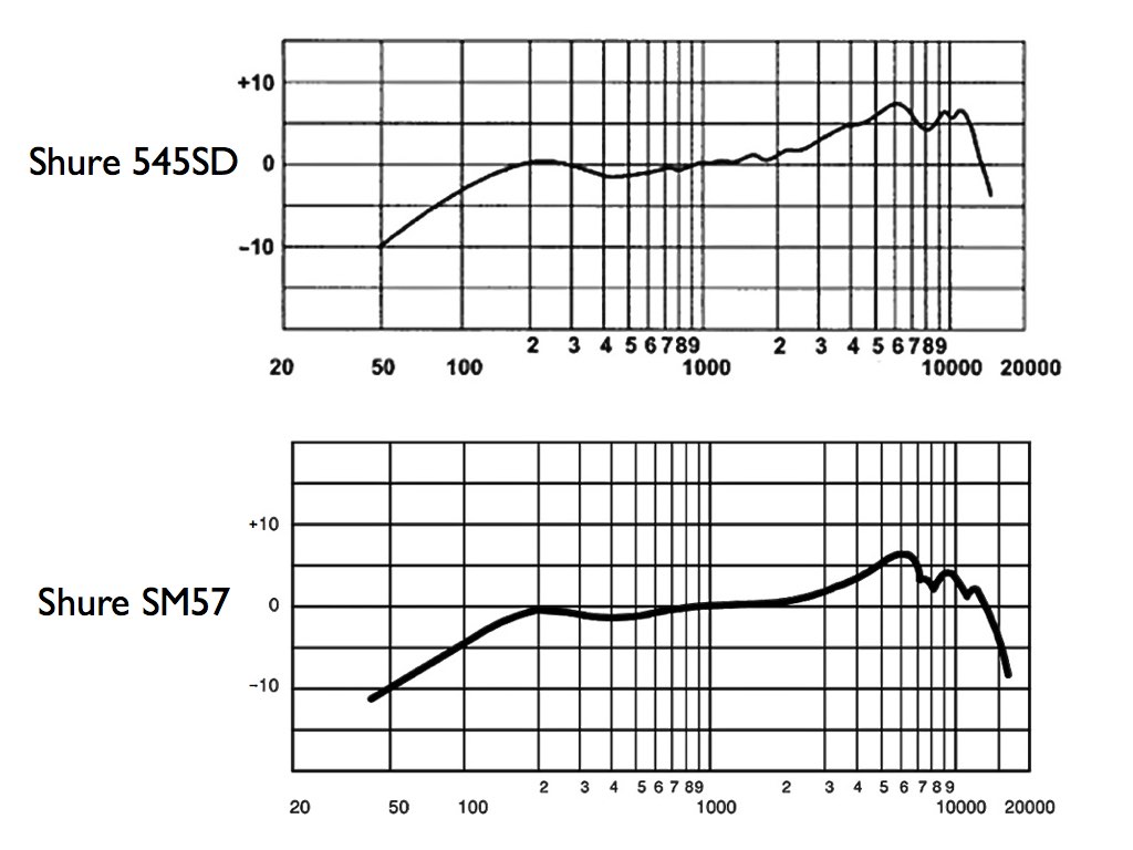 Shure 545SD:n bassot loppuvat noin 50 Hz:iin, kun taas diskanttialueella on selvästi pieni korostus 8-10 kHz:n alueella. SM57 tarjoaa hieman enemmän bassoa (40 Hz alarajana), kun taas diskanttiäänien vaimennus alkaa tässä aikaisemmin. Kriittisimmät taajuudet 200 Hz:n ja 6 kHz:n välillä näyttävät käytännössä identtisiltä näissä kaavioissa.