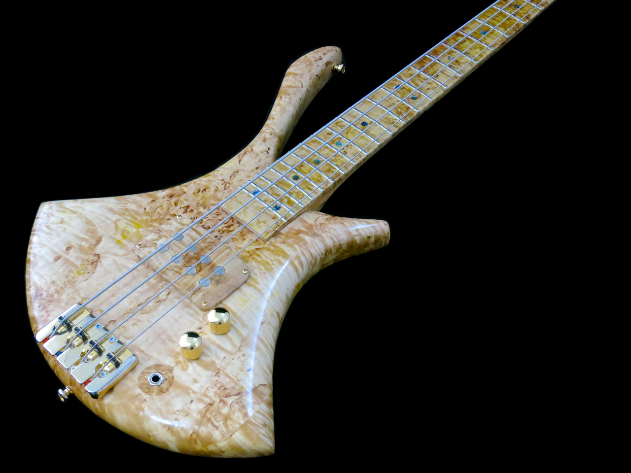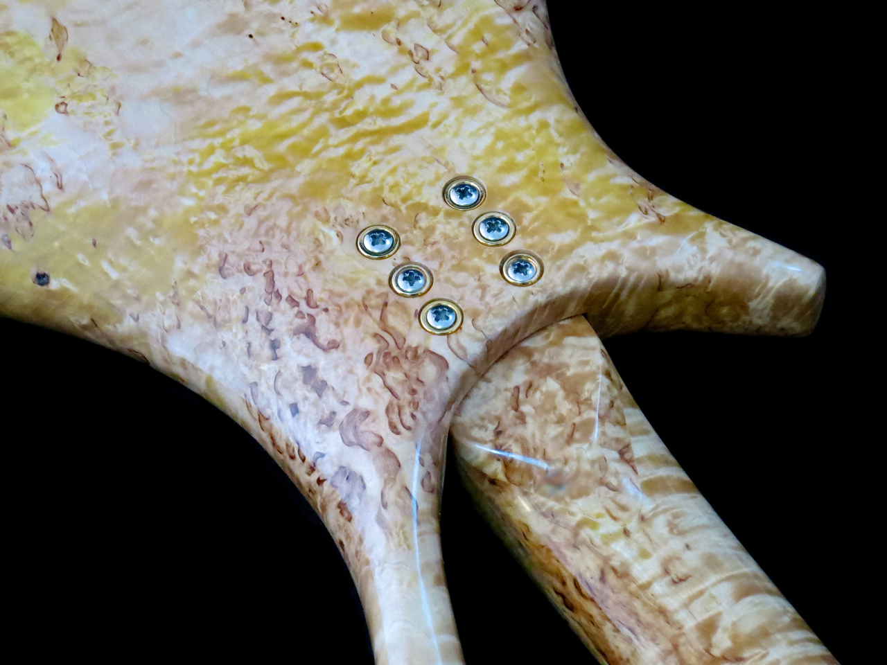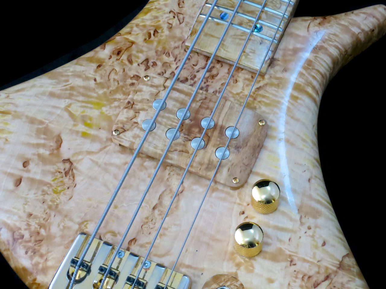 The Violinbirch has been crafted in its entirety from curly birch, while the Vikingman sports a plain birch neck with a curly birch fretboard, mated to body made from birch burl and flamed birch.