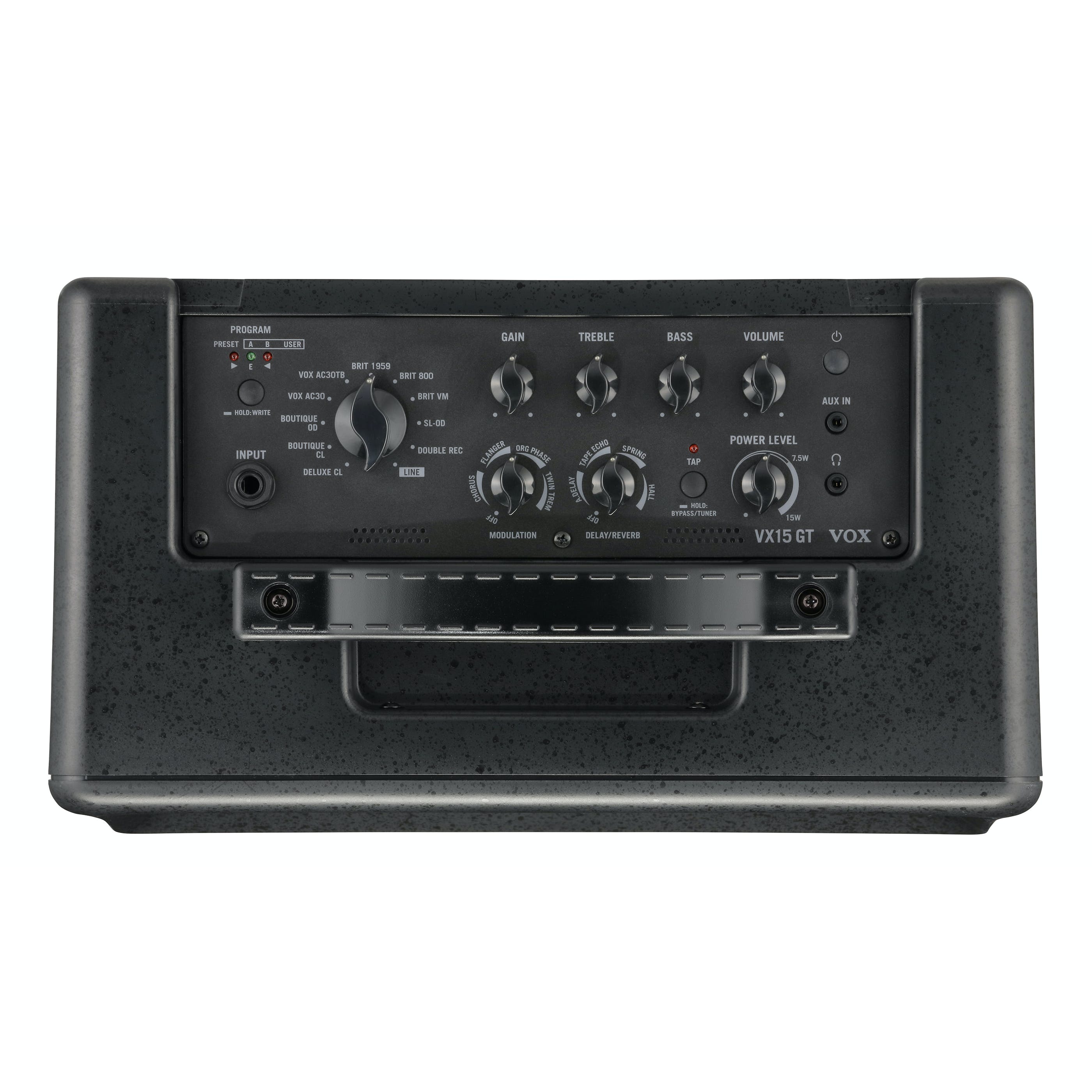The VX15-GT shares the control panel and signal-processing blocks with its larger brother, the VX50-GTV, but with one crucial difference. While the larger combo’s preamp section utilises Vox’ proprietary Nutube – a modern, low voltage tube – the VX15-GT uses Vox’ patented VET (Virtual Element Technology) digital modelling architecture.