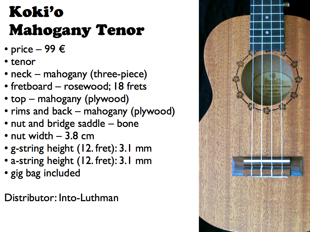 Testiyksilö näyttää olevan ns. maanantaikappale, vaikka soittimen työnjälki on sinänsä hyvin siistiä. Ukulelen sivuissa on nimittäin nähtävissä hieno sahausjälki/liimasauma. Joku on tehtaalla ilmeisesti sahannut sivut ensin perinteiselle ukulelelle sopiviksi, tajunnut sitten virheensä ja liimannut sen jälkeen molemmat sivut taas siististi yhteen. Vika on ainoastaan kosmeettinen, eikä se vaikuta lainkaan Mahogany Tenorin hyvään soitettavuuteen.