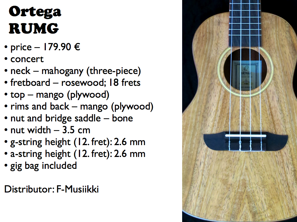 Ortegan uutuusmalli RUMG on konserttikokoinen ukulele käänteisellä sähkökitaran viritinlavalla, sekä mango-puusta tehdyllä kaikukopalla. Mango vaikuttaa ensisilmäykseltä ehkä hieman epätavalliselta valinnalta, mutta sen ulkonäkö muistuttaa aika lailla hyvin vaaleaa koa-puuta.