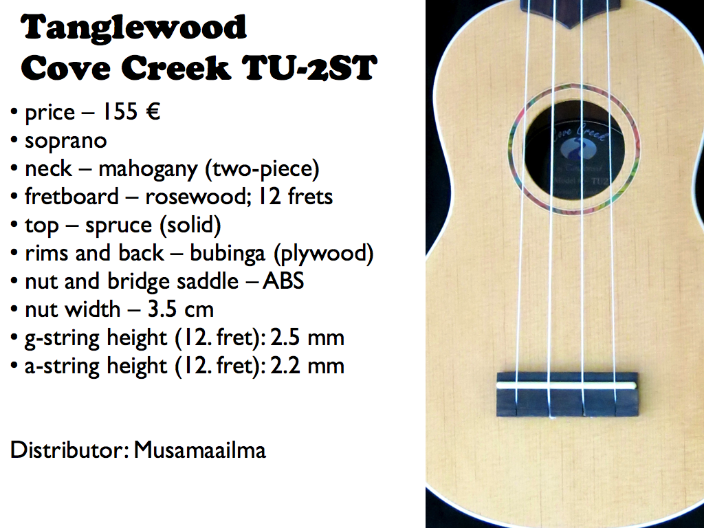 Tanglewood Cove Creek TU-2ST on tämän katsauksen ainoa kiiltäväksi lakattu soitin. Ulkomuodoltaan perinteiseen sopraanoon on valittu kokopuinen kuusikansi, sekä bubingavaneriset sivut ja takakansi.