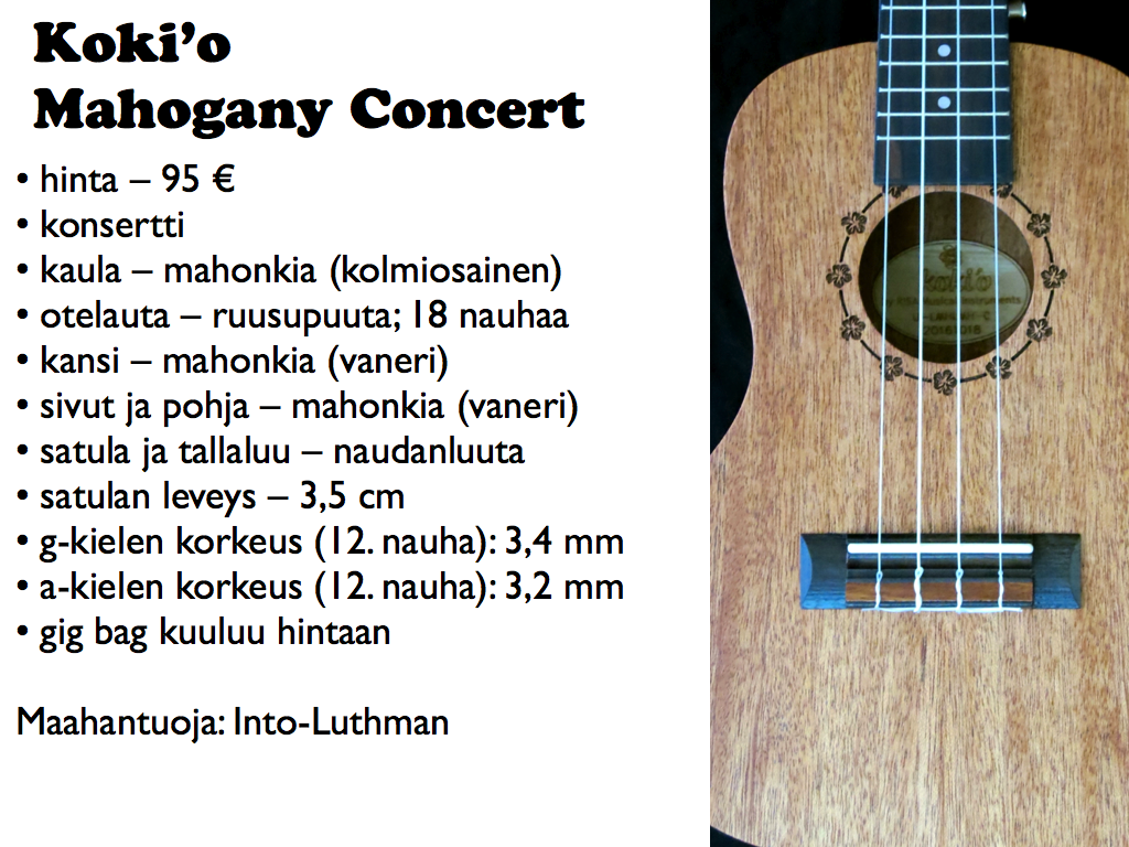 Mahogany Concertissa on perinteistä syvempi runko kaarevalla, muotoon prässätyllä pohjalla. Koki’o:n kaikissa soittimissa on kaksi hihnatappia valmiiksi asennettuna. Myös laadukas topattu pussi kuuluu hintaan.