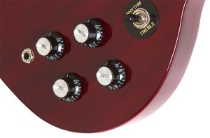 Epiphone G-400 Pro -malli komeilee Epiphone Alnico Classic Pro -humbuckereilla, joita voi volume-potikoihin piilotetuilla nostokytkimillä puolittaa. Kirsikanpunainen G-400 Pro on saatavilla myös vasenkätisenä.