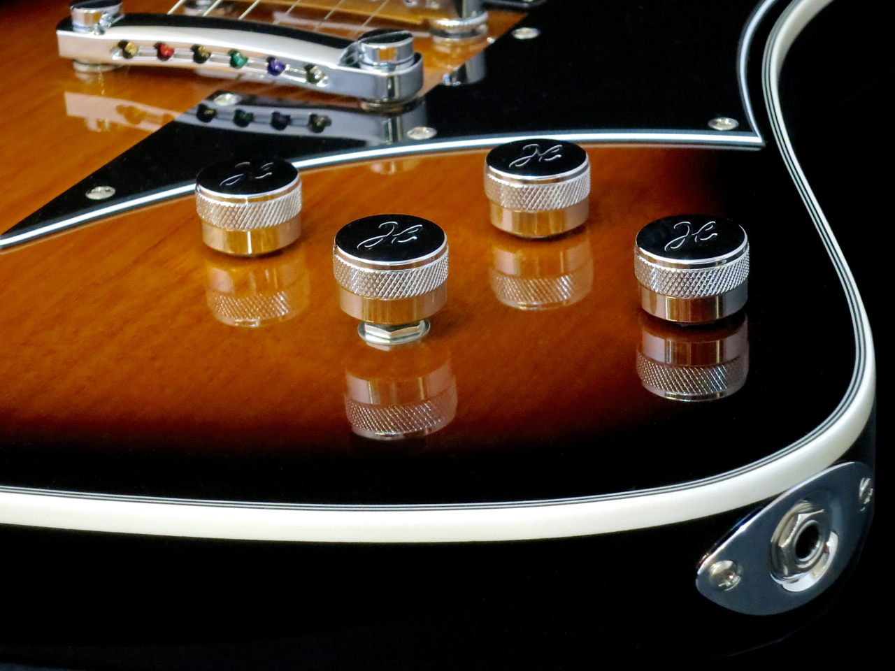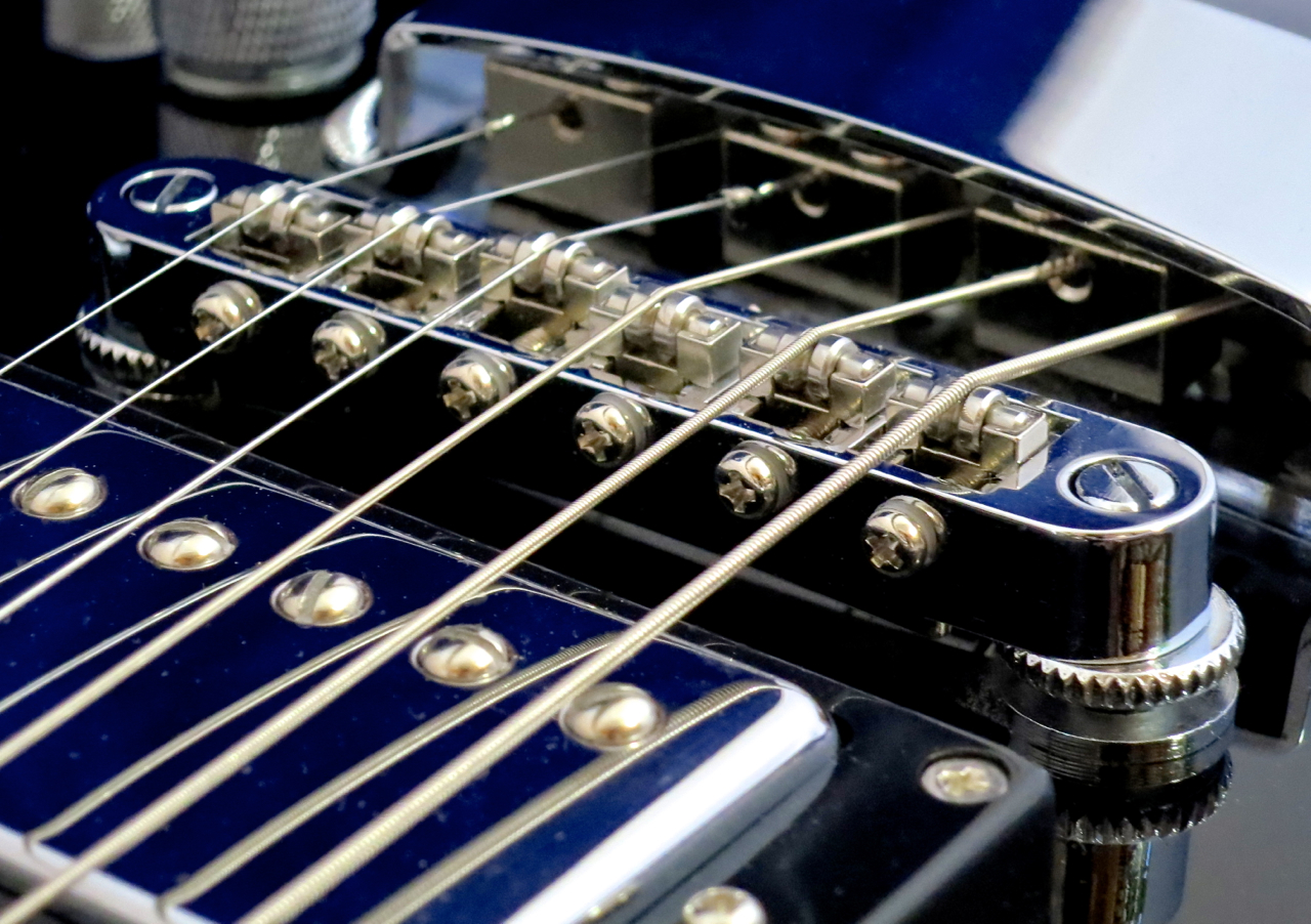 Hagström’s idiosyncratic tailpiece is made up of six brass string retainers mounted onto a plexiglass plate.