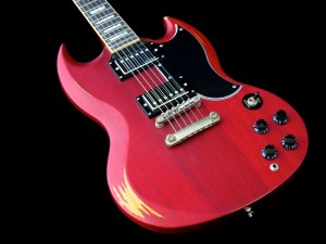 This guitar was the PRS Custom 24, a model which fuses certain Fender elements (the double cutaway body and the vibrato bridge) with the glued neck, mahogany body and general aesthetics the Gibson Les Paul was known for. The 25-inch scale lies halfway between Gibson and Fender, while the improved vibrato, the straight string pull headstock and many cosmetic touches, such as the bird inlays, the deep treble cutaway chamfer, and the faux binding, were all Paul Reed Smith’s own designs.