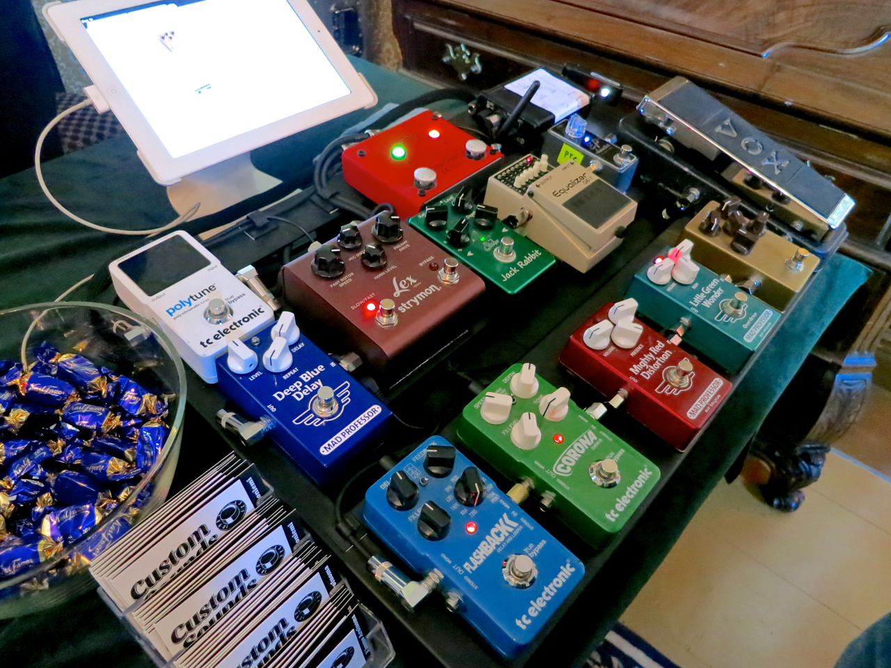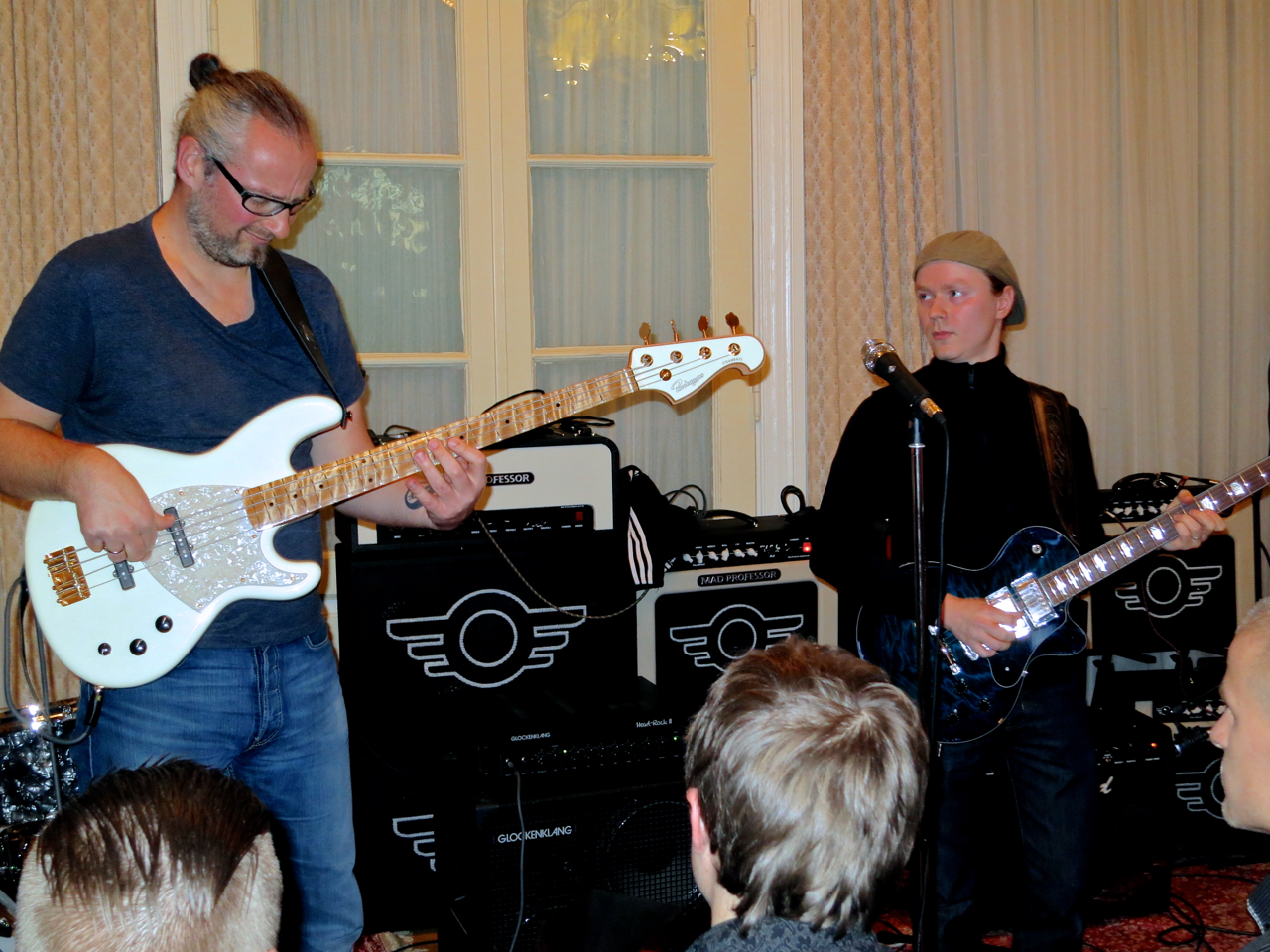 Tässä tsekkaan Mad Professorin uusia pedaaleja Mad Professor -vahvistimen läpi. Tonefestin vetäjä ja Mad Professorin puuhamies Harri Koski katsoo vierestä.