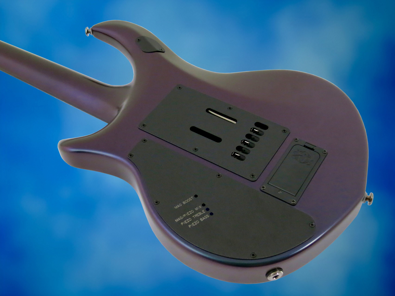 By using a tiny screwdriver you can adjust the active signal booster for the humbuckers, as well as set the maximum volume of the piezo signal, and the Fishman two-band EQ.