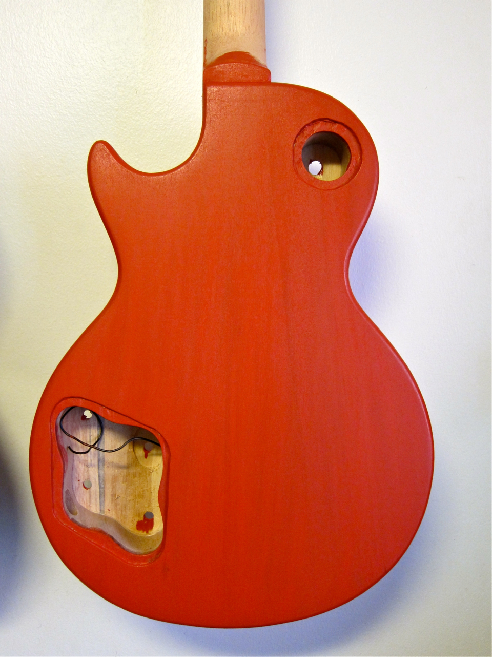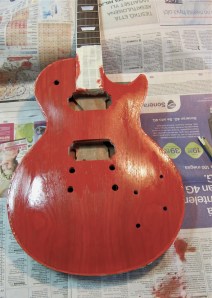 On the back and the neck working with Osmo Color was much more fun, easier, and quicker in drying. The end result is a nice tomato soupish red hue, with the finish feeling quite organic – a bit like Gibson’s Faded-series.