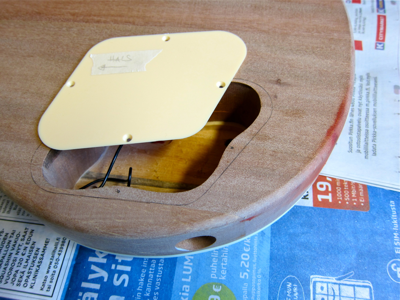 Hioin siis ensimmäiseksi hiomapaperilla (karkeus 240) varovasti kannen saarniviilua sulavaksi – kahden milin paksuus ei anna isoa virhemarginaalia! Sen jälkeen annoin hiomapaperilla myös kaulakorolle loppullisen muotonsa.