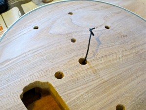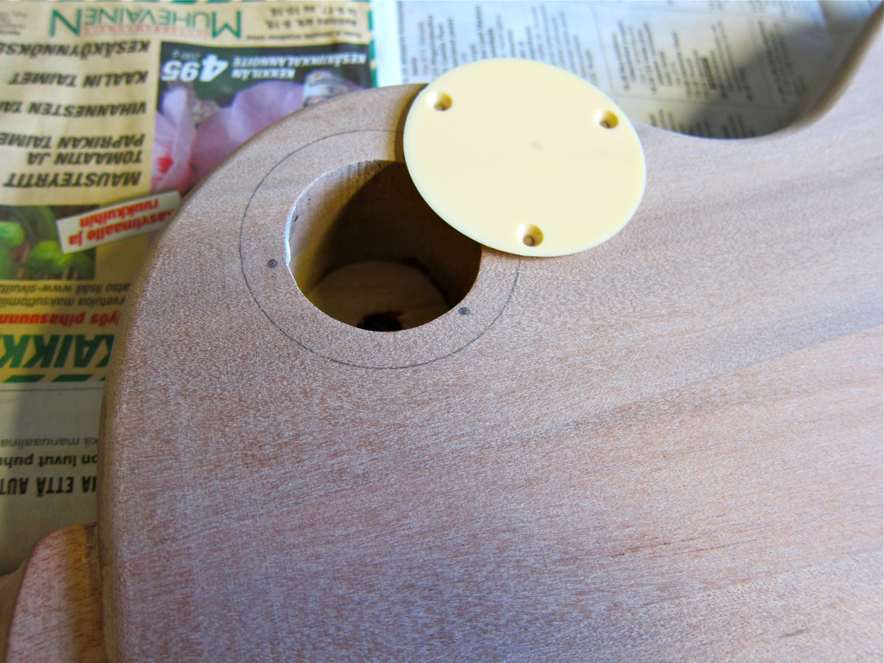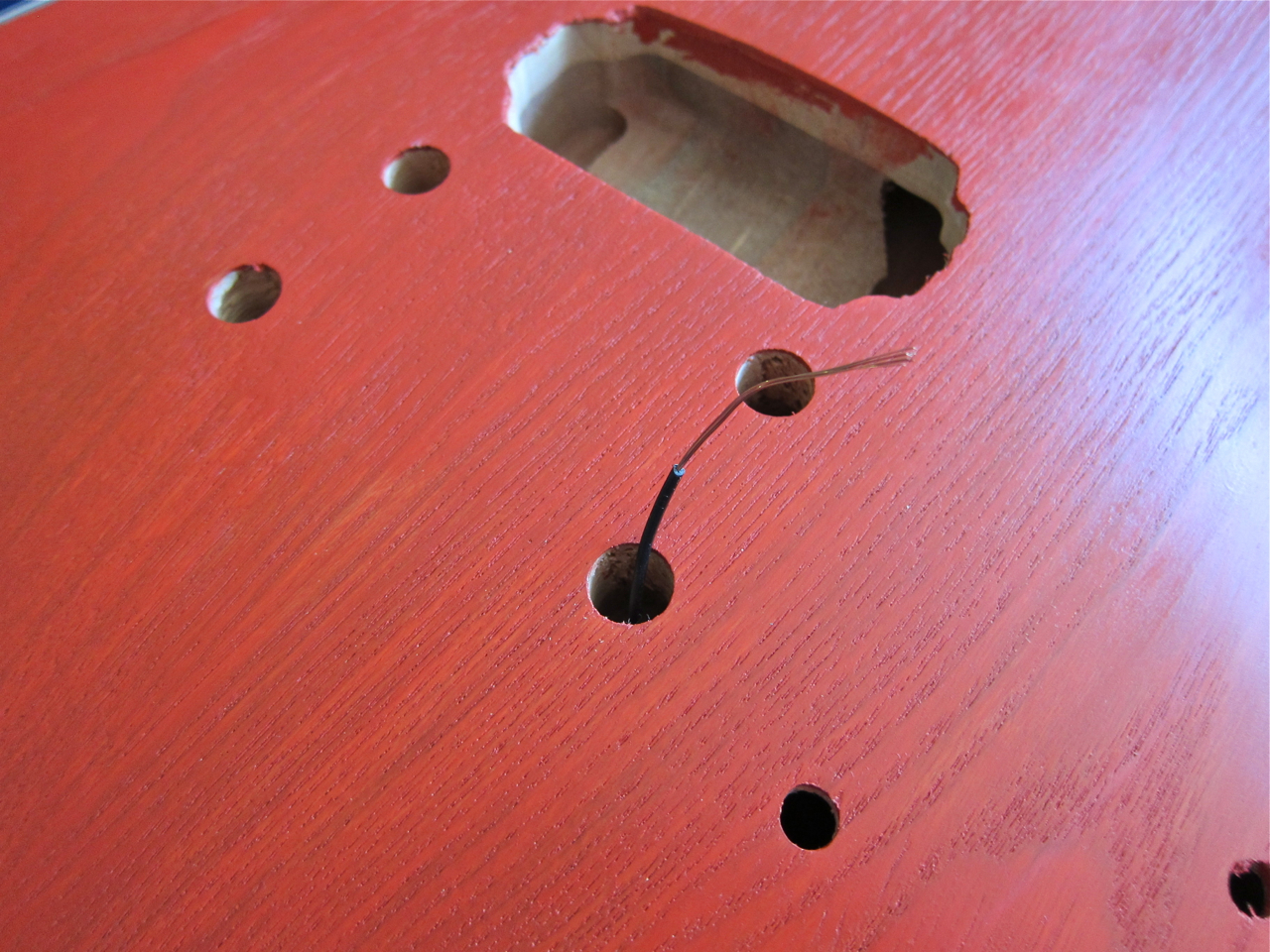Huomasin, että rungossa ei vielä ollut kanava kielten maadoitusta varten. Maadoitusjohto tai -lanka menee tavallisissa Les Paul –tyylisissä kitaroissa elektroniikkalokerosta kielipidimen holkkia varten porattuun reikään.