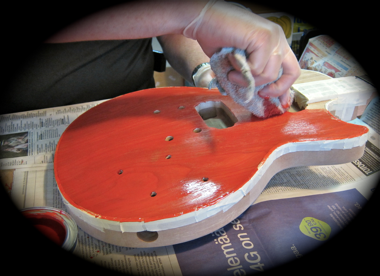 Päätin käsitellä ainakin kitaran kantta punaisella Osmo Color öljyvahalla, joka ei peittää puun kauniita syykuvioita.