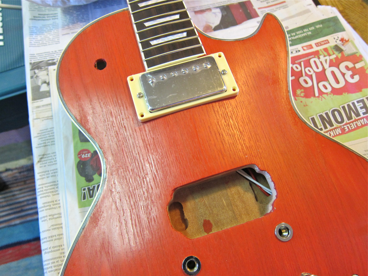 Interestingly, I found it harder to apply a consistent finish to the top’s ash veneer, compared to the mahogany used for both body and neck. The wax colour was harder to get even and flat, and much more red seeped beneath the masking tape onto the multi-ply binding.