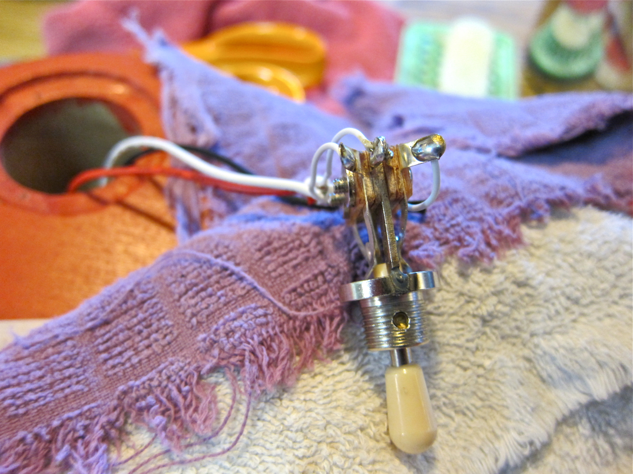 Tältä näyttää vipukytkin: kaksi keskimmäistä kontaktia toimivat lähtöinä, josta signaali kulkee suoraan lähtöjakille. Ulommat kontaktit taas ovat kytkimen tulot, yksi per volumepotikka. Vastapuolella (joka ei näy kuvassa) on kytkimen oma maadoituspiste.