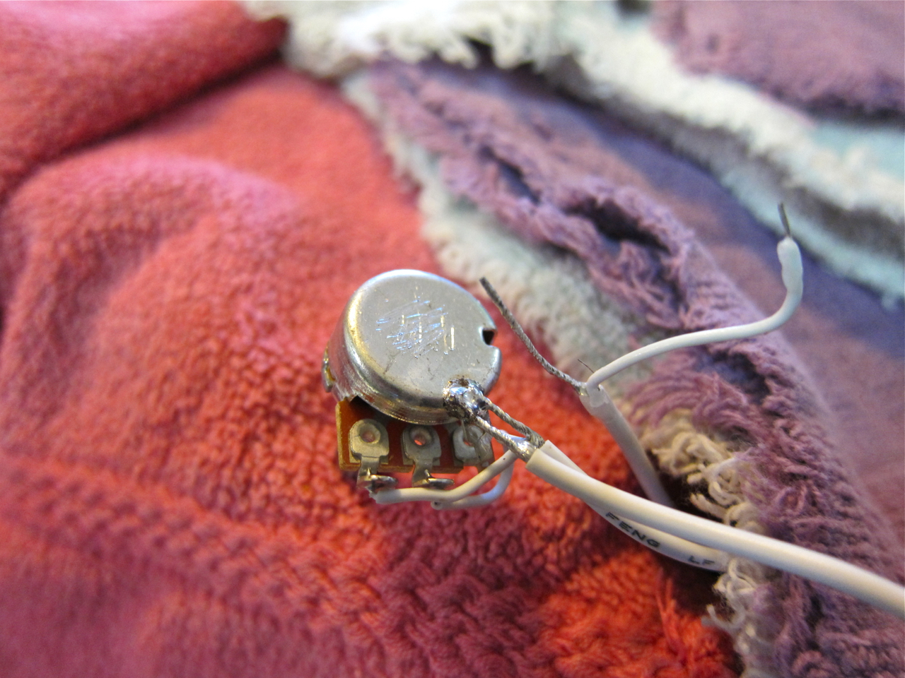 Mikrofonisignaalia kantavaa johtoa (tässä valkoinen) täytyy liittää potikan tuloon (kuvassa vasemmanpuoleinen kontakti), jossa on jo valmiiksi toinen johto juotettu kiinni. Mikrofonin maadoitus kiinnitetään potentiometrin koteloon. Kannattaa ensin raapia metallipintaa hieman karheaksi (esimerkiksi ruuvimeisselillä), koska se helpottaa juottamista.