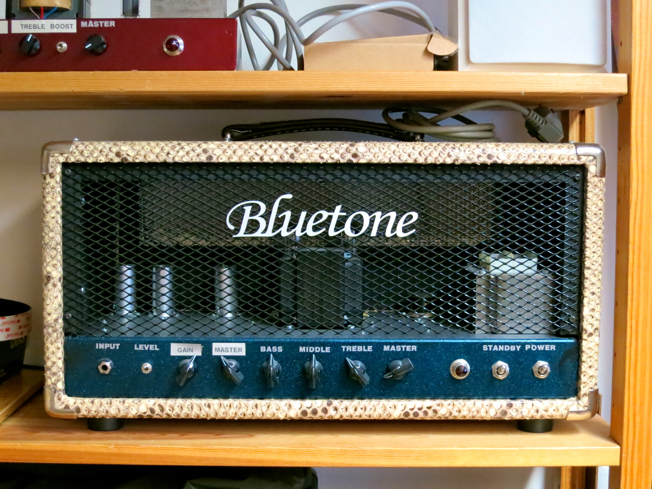 Eyelet- ja piirilevyt on lisätty koteloon vain näitä kuvia varten havainnollistamaan niiden lopulliset sijainnit. Vaikka Bluetone-vahvistimissa kitarasignaali kulkee aina ja vain käsinjuotetun point-to-point putki- ja analogielektroniikan kautta, käytetään luonnollisesti nykyelektroniikka, kun toteutetaan sellaiset ominaisuudet kuin esimerkiksi kanavanvaihdot MIDI:llä tai pääteputkien seurantaa ja biasointia Wifin kautta.