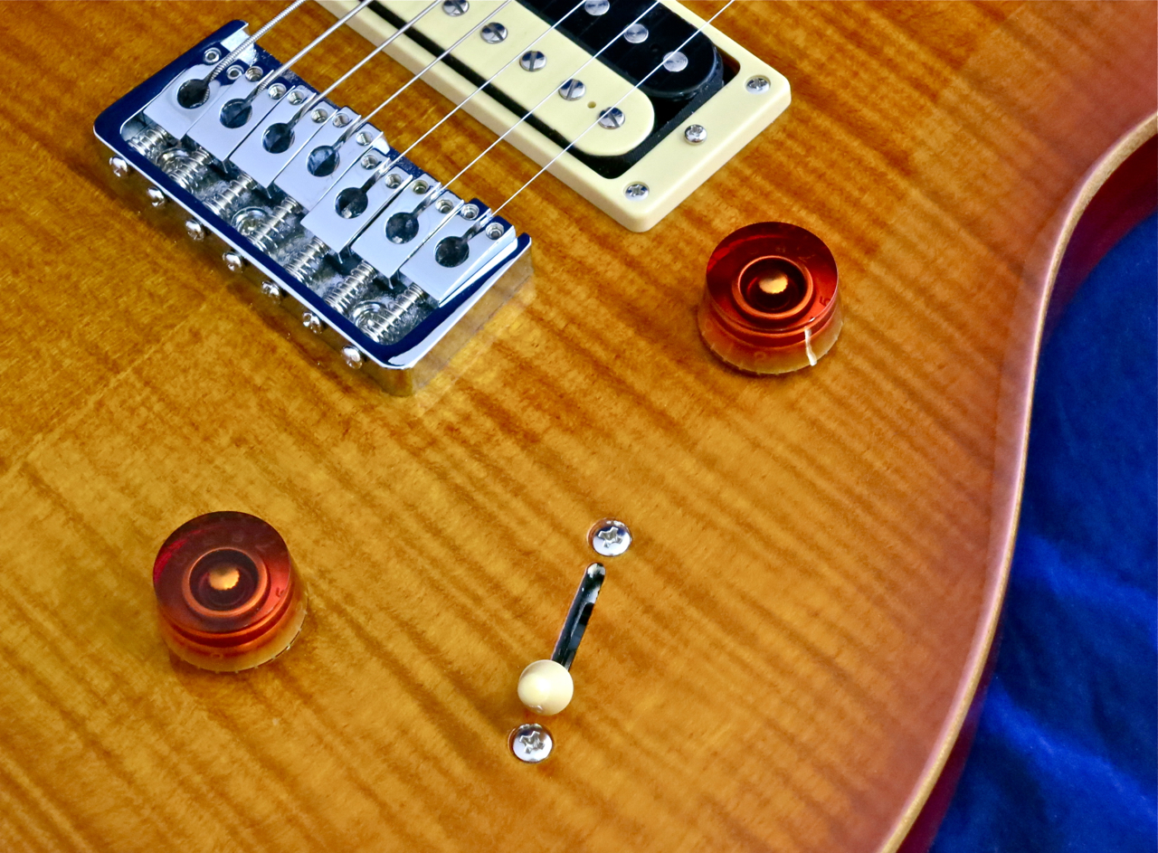 PRS:n patentoitu vibratalla on selvästi jykevämpi ilmestys kuin 50-luvun perinnevibrat. Kampi painetaan paikoilleen, ja sen liikkuvuus nylonkauluksessaan säädetään pienellä kuusiokoloruuvilla.