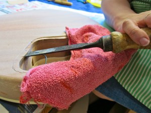 Interestingly, I found it harder to apply a consistent finish to the top’s ash veneer, compared to the mahogany used for both body and neck. The wax colour was harder to get even and flat, and much more red seeped beneath the masking tape onto the multi-ply binding.
