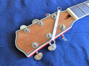 In my opinion the bound headstock on this ML-Factory kit is rather pretty, even though there are a couple of discoloured spots on the mahogany veneer (glue, perhaps?). I left the headstock face au naturel, using oil and wax.