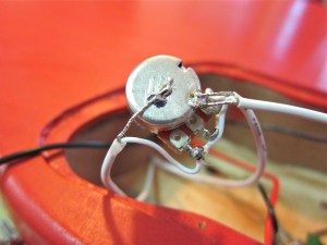 Mikrofonisignaalia kantavaa johtoa (tässä valkoinen) täytyy liittää potikan tuloon (kuvassa vasemmanpuoleinen kontakti), jossa on jo valmiiksi toinen johto juotettu kiinni. Mikrofonin maadoitus kiinnitetään potentiometrin koteloon. Kannattaa ensin raapia metallipintaa hieman karheaksi (esimerkiksi ruuvimeisselillä), koska se helpottaa juottamista.