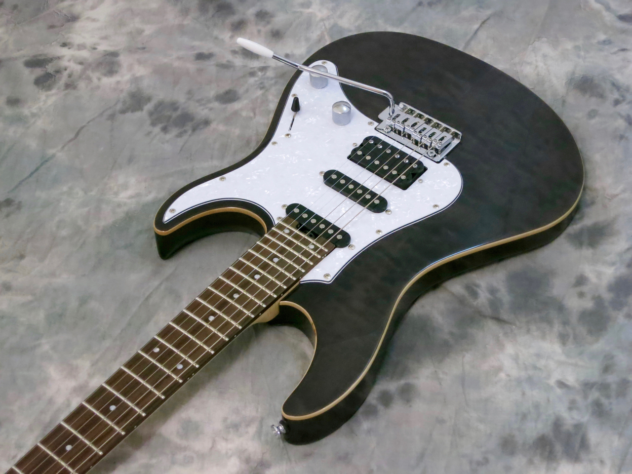 The body front has a quilted maple veneer and creme-coloured binding, wth the front and back finished in a gloss see-through black.
