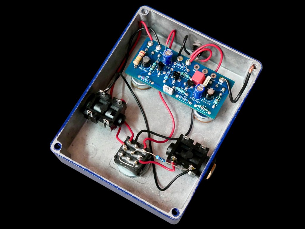 The Bluetone Rattlebox’ circuit is designed around three silicon transistors. The built-quality is top notch, without resorting to any point-to-point-voodoo. This effect runs on any Boss-type nine-volt power supply.