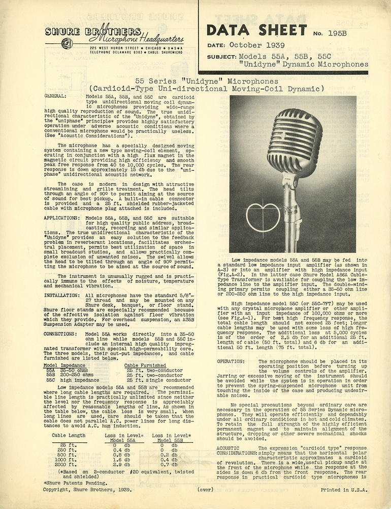 Alkuperäinen Shure Model 55 (tunnetaan nykyään nimellä ”Fat Boy” sen suuremman, pyöreän kotelon vuoksi) oli se, mitä äänimiehet olivat odottaneet. Tässä oli kompakti mikrofoni, joka mahdollisti signaalin voimakasta vahvistusta vain pienellä feedback-vaaralla. Lisäksi 55:n soundi oli laadukas, ja mikrofoni itse hyvin tukevasti toteutettu.