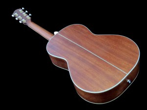 A Grand Auditorium’s body has about the same cubic content as a Dreadnought. Its rounder shape with a more slender waist makes it more comfortable to play, and also produces a different basic voicing. Grand Auditoriums tend to sound more open with added clarity in the lower midrange  (between 600 – 800 Hz) compared to a Dreadnought, making them easier to record.