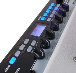 The Mooer’s control panel is top-facing, with its black portion offering access to the combo’s patch memory, as well as all of the preamp’s effect blocks. The backlit buttons on the left of the display also let you activate the SD75’s Jam Mode section, which comprises a 150 second audio looper and a simple drum pattern player/metronome, featuring 40 drum patterns and 10 different metronome styles. The built-in chromatic tuner, on the other hand, is accessed by a button just above the Treble knob.