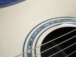 Black and white rings coupled with cleanly inlaid abalone make up the soundhole rosette.